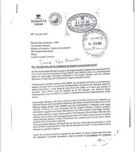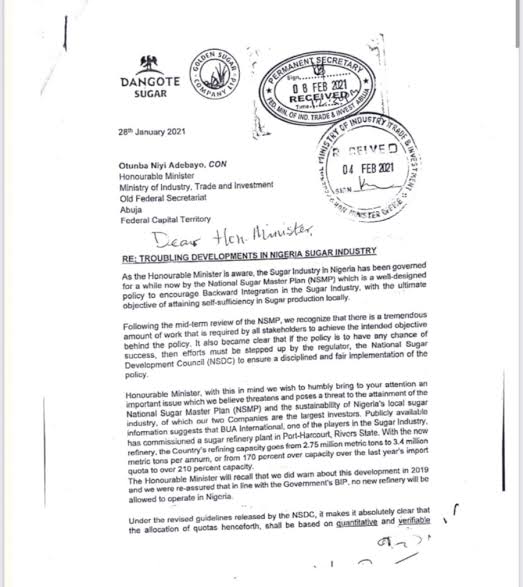 In the letter dated 28th January 2021 signed by Aliko Dangote himself as the Chairman Dangote Industries Limited, the billionaire claimed that when the BUA Sugar refinery was opened , he warned the Government and they told him that no new refinery would be allowed to operate in Nigeria’. Dangote accused BUA of operating with impunity by contavening the laws as laid down in the National sugar policy by selling it’s products locally instead of producing for export alone.