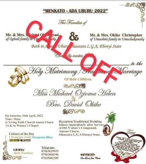 “I AM CALLING OFF THE WEDDING AND TRADITIONAL MARRIAGE (IGBA NGWU) BETWEEN ME AND DAVID OKIKE that supposed to hold on this Saturday 16th, April 2022.