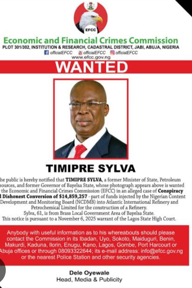 “Sylva, 61, is from Brass Local Government Area of Bayelsa State. This notice is pursuant to a November 6, 2025, warrant of the Federal High Court, Lagos.