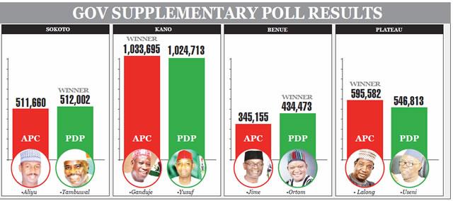 The states where the governorship run-off poll was held on March 23 are Sokoto, Plateau, Kano, Benue and Bauchi.
