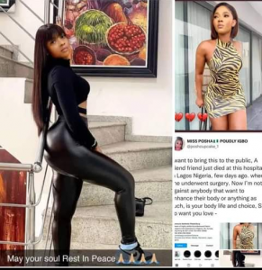 A friend of hers, Miss Posha confirmed her death and shed light on she died from the botched surgery complications.