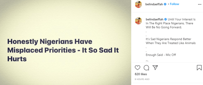 Nollywood actress, Belinda Effah took to her Instagram page to lash out at Nigerians over what she termed as “misplaced priorities”.