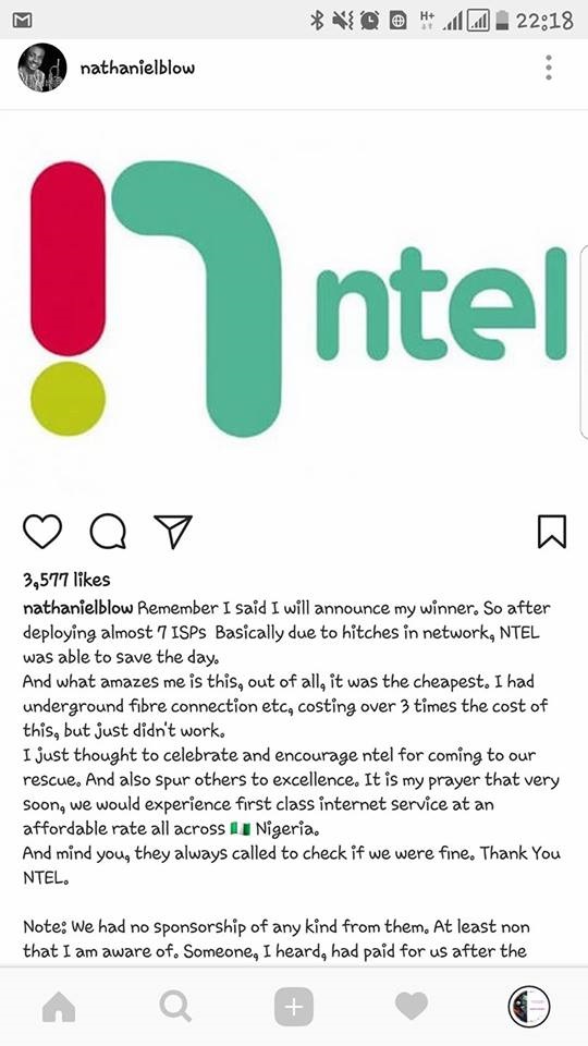 In an acknowledgment ntel thanked Nathaniel Bassey for his endorsement. “Thanks nathanielblow for the shout out. At ntel, we saw a good cause and thought to support it with Nigeria’s superfast internet service. Thanks to Victoria Bassey for letting us join your team in raising a song of praise all those nights. People have been blessed and so have we.”