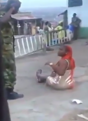 In a viral video, a young lady wearing a camisole and orange attachment was made to sit on the bare floor at a filling station, while a soldier whipped her buttocks.