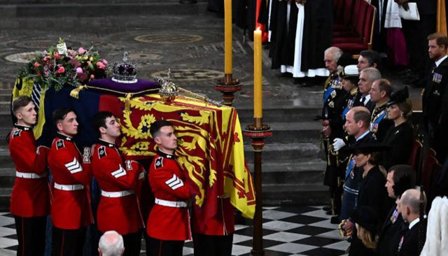 Then, 142 Royal Navy sailors used ropes to draw the gun carriage carrying her flag-draped coffin to Westminster Abbey, where pallbearers bore it inside and about 2,000 people, ranging from world leaders to healthcare workers gathered to mourn.